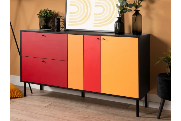 Doprajte vášmu interiéru kvapku extravagancie napríklad s touto komodou Lucca, ktorá zaujme na pohľad. Moderný dizajn skrinky podčiarkuje kombinácia čiernej, červenej a oranžovo-žltej farby, ktorá príjemne rozžiari byt. Komoda so šírkou 146 cm tak môže vytvoriť zaujímavý solitér nielen v priestore obývačky, ale aj kdekoľvek inde. Praktické usporiadanie so zásuvkami a otočnými dverami umožňuje praktické ukladanie vecí menších aj väčších vecí, navyše konštrukcia na kovových nôžkach umožní využívať robotický vysávač.