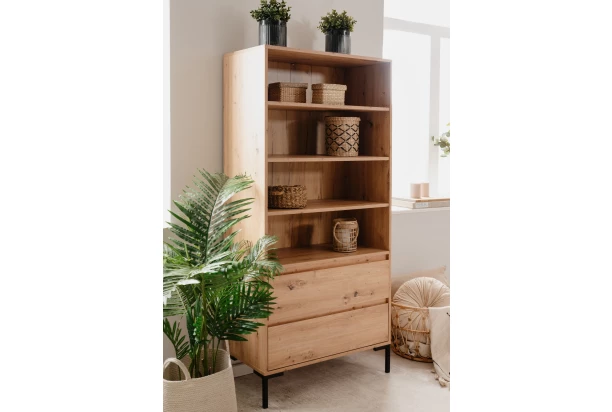 Široký regál so zásuvkami z kolekcie Korsika – trendový nábytok v drevodekore dub artisan zútulní priestor celého bytu. Členité horizontálne línie dopĺňa čierna kovová podnož, vďaka ktorej môžete ľahko udržiavať podlahy alebo využívať robotický vysávač.
