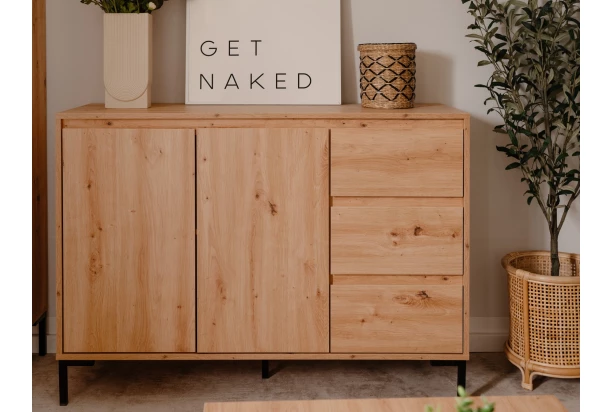 Komoda so zásuvkami z kolekcie Korsika – trendový nábytok v drevodekore dub artisan zútulní priestor celého bytu. Členité horizontálne línie dopĺňa čierna kovová podnož, vďaka ktorej môžete ľahko udržiavať podlahy alebo využívať robotický vysávač.