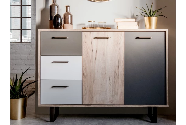 Komoda so zásuvkami z kolekcie Orlandos – moderný a hravý dizajn nábytku oživí Váš interiér. Kombináciu dubového drevodekoru s plochami bielej, šedej a antracitovej farby dopĺňajú čierne kovové úchyty a podnož, vďaka ktorej pôsobí nábytok ľahko a zároveň umožňuje jednoduchú údržbu podlahy.