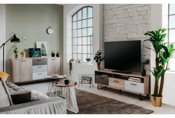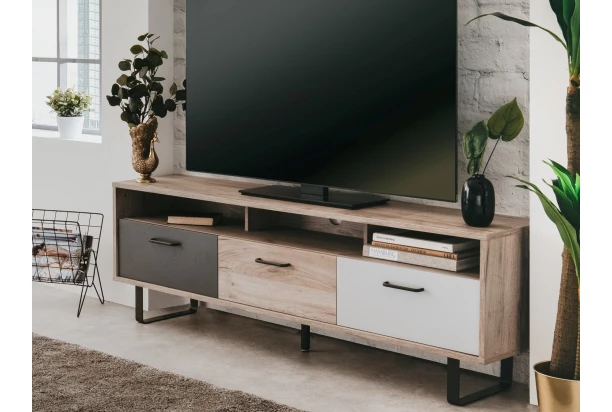 TV skrinka so šírkou 160 cm z kolekcie Orlandos – moderný a hravý dizajn nábytku oživí Váš interiér. Kombináciu dubového drevodekoru s plochami bielej, šedej a antracitovej farby dopĺňajú čierne kovové úchyty a podnož, vďaka ktorej pôsobí nábytok ľahko a zároveň umožňuje jednoduchú údržbu podlahy.