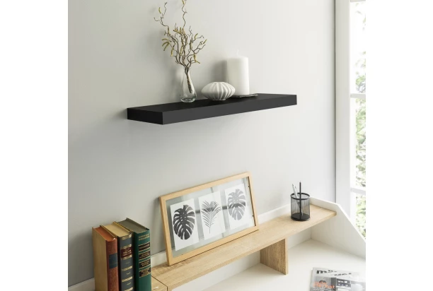 Polica na stenu so šírkou 60 cm vo farbe čierna mat – jednoduchý univerzálny design pasuje do každého interiéru aj miestnosti. Kovové konzoly na zavesenie sú prakticky ukryté zo zadnej strany.