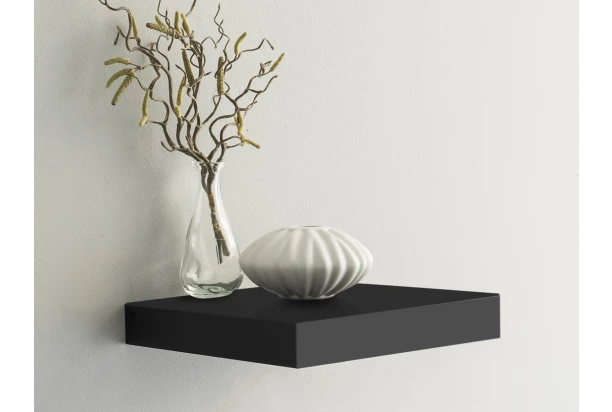 Polica na stenu o šírke 23,5 cm vo farbe čierna mat – jednoduchý univerzálny design pasuje do každého interiéru aj miestnosti. Kovové konzoly na zavesenie sú prakticky ukryté zo zadnej strany.