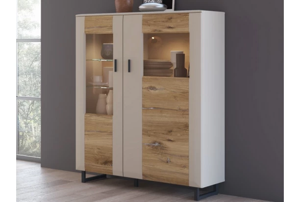 Skrinka s presklením z kolekcie Rómov – originálne riešený nábytok so zaoblenými hranami zaujme na pohľad. Zaujímavý dizajn nábytku podčiarkuje kombináciu svetlej šedej/dub flagstaff, ktorá pôsobí moderne a útulne zároveň.