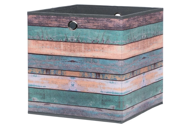 Úložný látkový box s potlačenými motívmi farebných drevených dosiek poslúži ako praktická súčasť regálu alebo ako vnútorné vybavenie skriniek, prípadne ho môžete umiestniť samostatne. Jeho konštrukciu je možné kedykoľvek ľahko zložiť a uschovať.