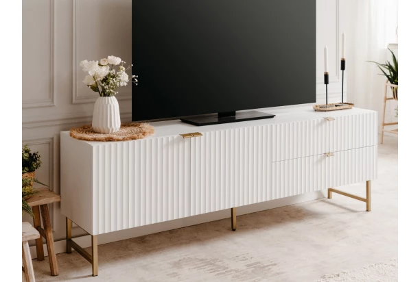 Široká TV skrinka z radu Edinburgh – štýlový nábytok zaujme na pohľad bielymi štruktúrovanými povrchmi, úchytkami a kovovou podnožou v mosadznom prevedení. Tento nábytok tak vynikne a ozvláštni atmosféru v každom interiéri.