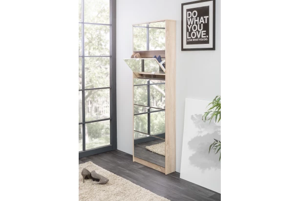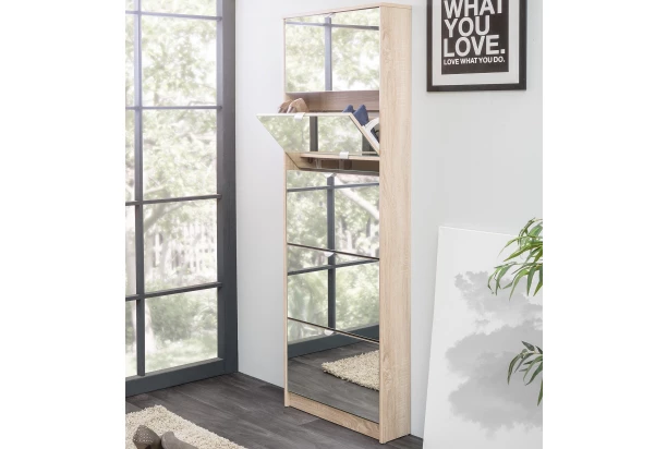 Vysoký botník s 5 výklopnými dverami a vnútornými priehradkami na topánky rozmerovo pasuje do každého priestoru predsiene. Vyrobený v dekore dub sonoma a doplnený prednými zrkadlovými plochami, ktoré zároveň opticky zväčšia priestor vo vnútri predsiene.