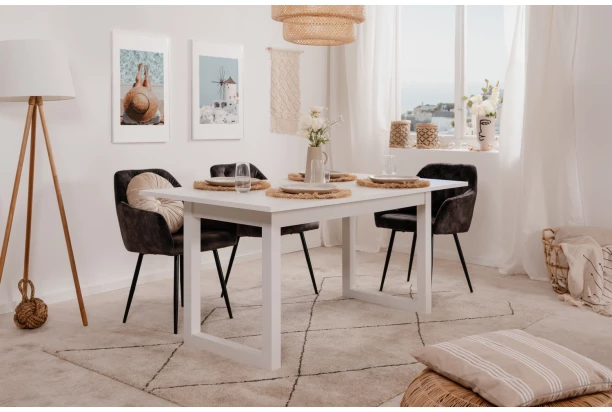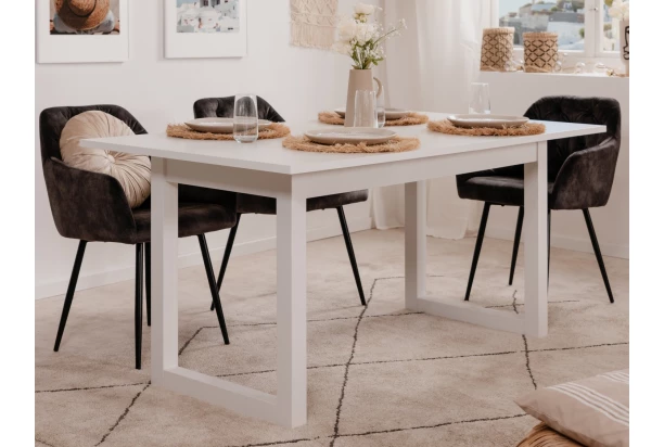 Jedálenský stôl s rozkladacou funkciou z kolekcie Denver – nábytok v mestskom industriálnom štýle, pôsobí veľmi moderne a dáva Vám možnosť vytvárať dizajnové interiéry v mladistvom duchu. Biely jedálenský stôl vyniká širokými bočnými rámami a zosilnenou bielou podnožou, ktorá poskytuje stolu výbornú stabilitu.