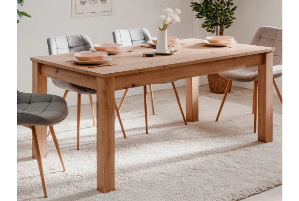 Jedálenský stôl z kolekcie Bergen – obdĺžny stôl o veľkosti 160×90 cm je vyrobený v drevodekore dub artisan. Široké rámy a mohutné nohy poskytujú stolu potrebnú stabilitu. Vďaka rozkladacej funkcii je možné plochu stola rozšíriť na 215 cm a pohostiť tak celú rodinu a priateľov.