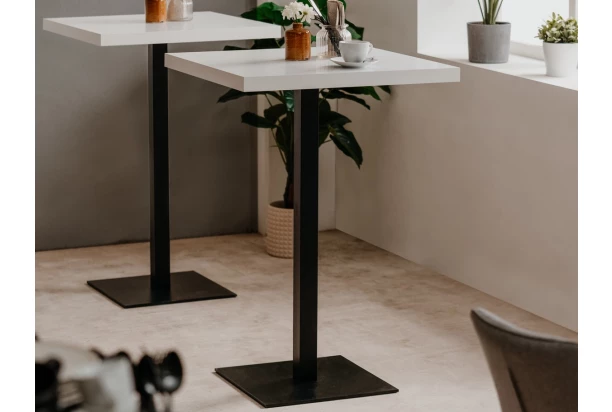 Štvorcový barový stôl s veľkosťou 70×70 cm v univerzálnom štýle sa hodí do každého moderného interiéru. Bielu hornú plochu dopĺňa stabilná kovová podnož v čiernom prevedení.