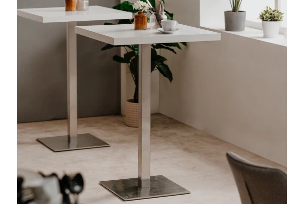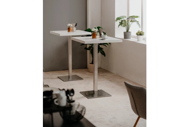 Štvorcový barový stôl s veľkosťou 70×70 cm v univerzálnom štýle sa hodí do každého moderného interiéru. Bielu hornú plochu dopĺňa stabilná kovová podnož v brúsenom nerezovom prevedení.
