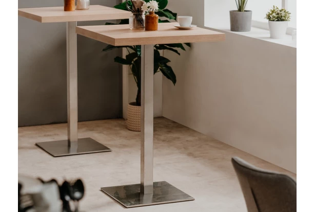Štvorcový barový stôl s veľkosťou 70×70 cm v univerzálnom štýle sa hodí do každého moderného interiéru. Hornú plochu v drevodekore dub sonoma dopĺňa stabilná kovová podnož v brúsenom nerezovom prevedení.