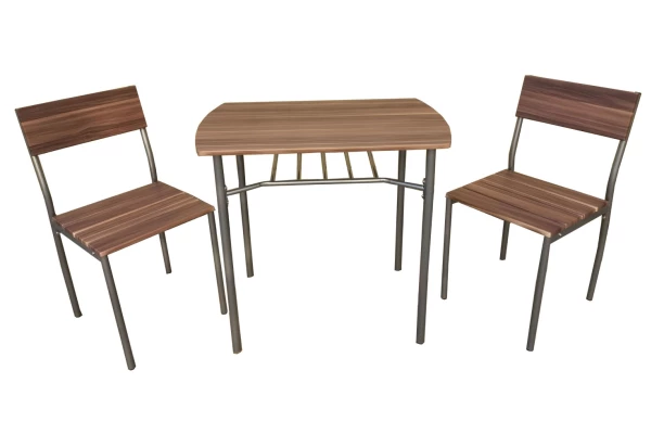 Jednoduchý jedálenský set v dekore orech obsahuje 3 diely – malý jedálenský stôl o veľkosti 82×52 cm a dve stoličky, ktoré ľahko pod stôl zasuniete a ušetríte tak okolitý priestor. Jedálenská zostava je ideálna aj do veľmi malého bytu.