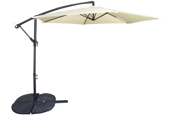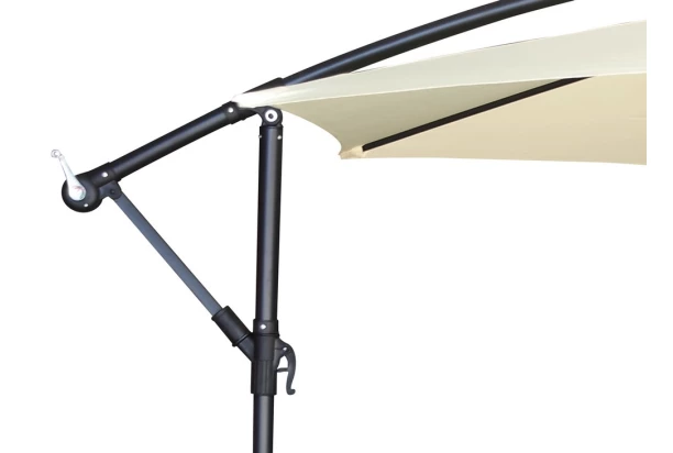 Veľký béžový záhradný slnečník s priemerom 300 cm, pod ktorý je možné ukryť celú zostavu záhradného nábytku. Na kovovej konštrukcii a s kľukou na ľahké sklápanie.