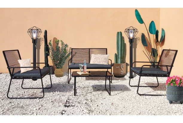 Záhradný 4-dielny set nábytku sa rozmerovo hodí na každú záhradu, terasu aj napríklad balkón. Čierna kovová konštrukcia s trendy prepletením je doplnená sedacími vankúšmi pre pohodlné posedenie pri káve alebo osviežujúcom drinku. Obsahuje dvojmiestnu lavicu, dve kreslá a obdĺžny stolík.