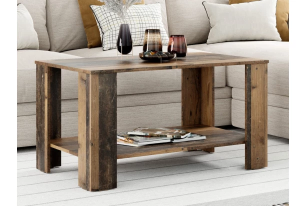 Obdĺžnikovy konferenčný stolík v klasickom univerzálnom štýle má zvýšenú konštrukciu s výškou 54 cm na praktické využitie. Vyrobený vo vintage optike dreva.