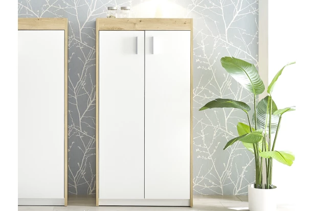Univerzálna skrinka so šírkou 64 cm s vnútornými policami a hornou odkladacou priehradkou môže byť využitá aj ako botník. Vyrobená v dekore dub artisan/biela. Do zapustenej priehradky v hornej konštrukcii prakticky odložíte napríklad kľúče, ovládače, časopisy, knižky, dokumenty alebo ďalšie drobnosti.