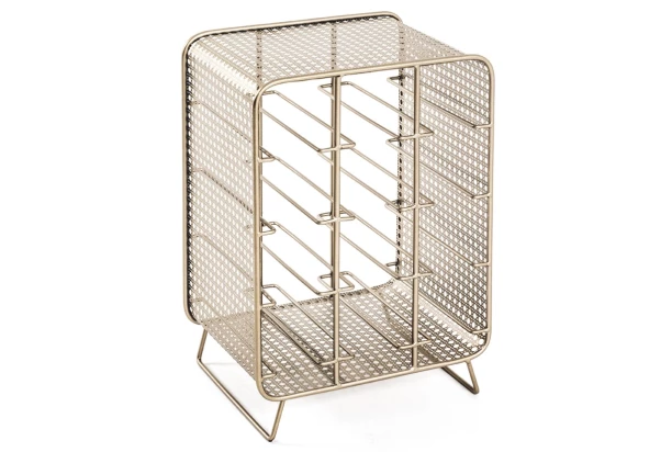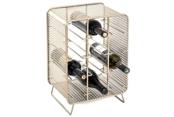 Kovový stojan na fľaše v prevedení zlatý lak má vonkajšie plochy v imitácii viedenského výpletu. Pôsobí luxusne zaujme na pohľad. Stojan poslúži na akékoľvek ukladanie fliaš, nielen na víno.
