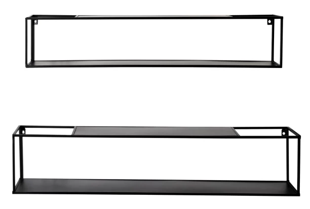 Set obsahuje 2 kusy nástenného regálu so šírkou 95 cm a 85 cm. Moderný dizajn z čierneho kovu ľahko pasuje do interiérov v rôznych štýloch. Tieto moderné police využijete v akejkoľvek miestnosť vášho bytu.