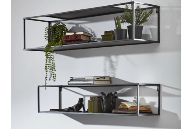 Set obsahuje 2 kusy nástenného regálu so šírkou 85 cm a 75 cm. Moderný dizajn z čierneho kovu ľahko pasuje do interiérov v rôznych štýloch. Tieto moderné police využijete v akejkoľvek miestnosťi Vášho bytu.