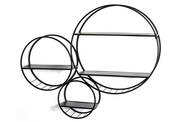 Závesný policový regál v modernom dizajne troch kruhov je vyrobený z čierneho kovu, do 4 priehradiek ľahko uložíte dekorácie, knižku, kvety alebo veci dennej potreby. Netradičný regál navyše vynikne na každej stene.