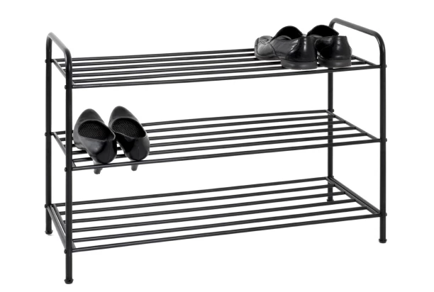 Čierny kovový regál na topánky sa so svojim univerzálnym dizajnom hodí do modernej aj klasickej predsiene. Regálový botník ponúka 3 police na odkladanie až 12 párov topánok.