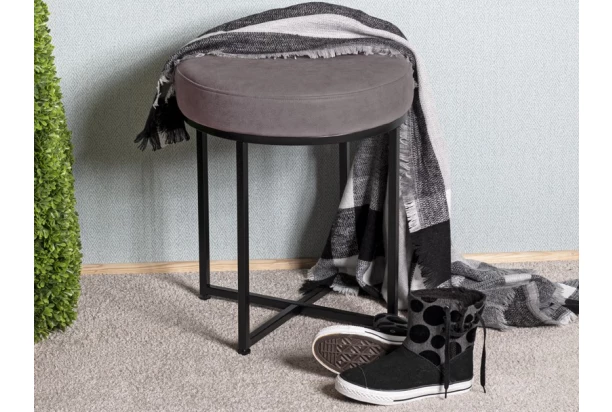 Moderný taburet na čiernej kovovej podnoži má šedý polstrovaný sedák očalúnený látkou v optike brúsenej kože.