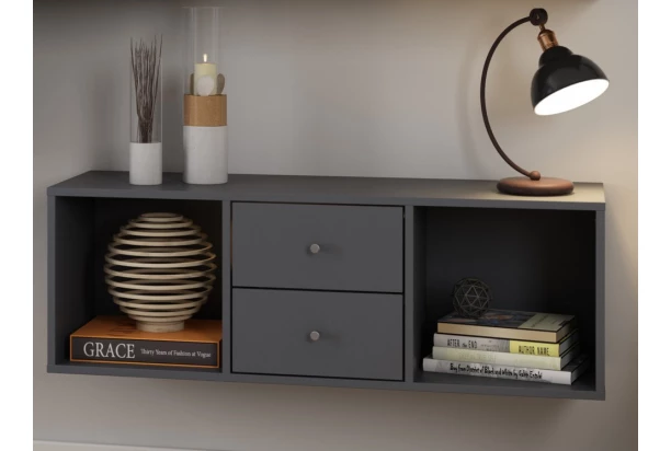 Nástenný regál s 3 priehradkami v grafitovej farbe z programu Jerry – regál môžete navyše ľubovoľne doplniť dvierkami alebo zásuvkami a prispôsobiť si ho tak svojim potrebám. Nábytkový rad Jerry ponúka regály s niekoľkými veľkosťami, z ktorých je možné na stene vytvoriť ľubovoľne veľkú zostavu na ukladanie akýchkoľvek predmetov. Univerzálne regály nájdu svoje využitie nielen v obývačke a domácej pracovni, ale aj v kuchyni, jedálni alebo napríklad predsieni, kdekoľvek len budete chcieť.