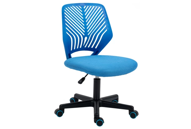 Detská stolička k písaciemu stolu má mäkko polstrovaný sedák potiahnutý modrou látkou a ponúka možnosť výškového nastavovania.