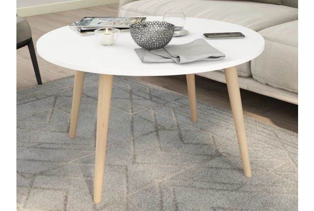 Okrúhly konferenčný stolík na drevených nôžkach vyzerá útulne. Odkladacia plocha stolíka s priemerom 80 cm je vyrobená v bielom prevedení. Stolík je stabilný a zároveň pôsobí v priestore interiéru vzdušne.