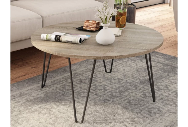 Okrúhly konferenčný stolík s priemerom 80 cm je vyrobený v dekore dub sonoma a skvele doplní štýlovo zariadenú obývačku. Čierna kovová podnož je stabilná a zároveň pôsobí vzdušne.