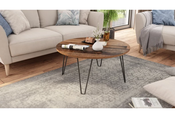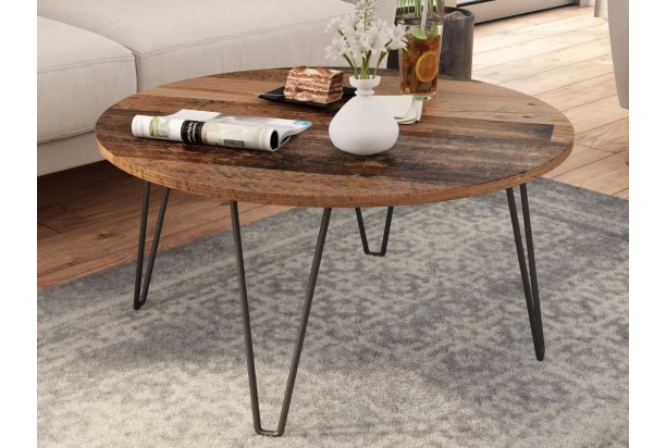 Okrúhly konferenčný stolík s priemerom 80 cm je vyrobený vo vintage optike dreva a skvele doplní štýlovo zariadenú obývačku. Čierna kovová podnož je stabilná a zároveň pôsobí vzdušne.