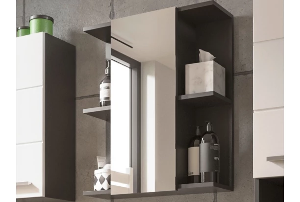 Kúpeľňová zrkadlová skrinka z programu Gloss je vyrobená v dekore antracit a bude dobre pasovať do moderne zariadenej kúpeľne. Stredové dvere so zrkadlom dopĺňajú praktické bočné odkladacie priehradky.
