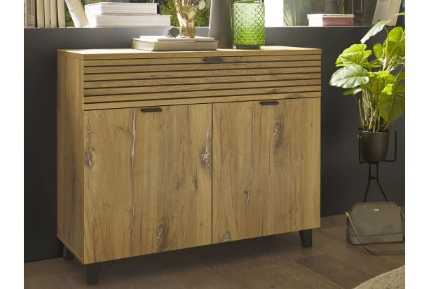 Komoda so zásuvkou z kolekcie Trattino – štýlový nábytok pre tých, ktorí chcú mať spálňu zariadenú moderne, prakticky a zároveň útulne. Príjemné tóny dubového drevodekoru dopĺňajú profilované povrchy, ktoré vytvárajú na predných plochách zaujímavý lamelový efekt. Skrinka so šírkou 111 cm má širokú zásuvku s vnútorným delením na prehľadné ukladanie. Komoda prakticky poslúži v akejkoľvek miestnosti vášho bytu.