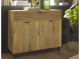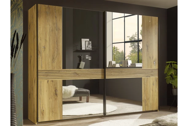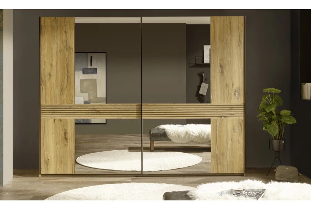 Šatníková skriňa z kolekcie Trattino – štýlový nábytok pre tých, ktorí chcú mať spálňu zariadenú moderne, prakticky a zároveň útulne. Príjemné tóny dubového drevodekoru dopĺňajú profilované povrchy, ktoré vytvárajú na predných plochách zaujímavý lamelový efekt. Priestranná skriňa so šírkou 270 cm má ľahko posuvné dvere so zrkadlami, za ktorými nájdete šatníkové tyče a police. Vnútorné priestory skrine je možné navyše ľubovoľne doplniť ďalšími policami alebo vnútorným zásuvkovým elementom na drobnú bielizeň.