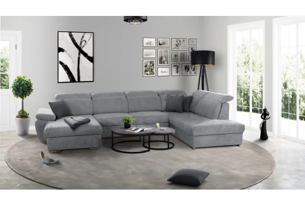 Komfortná sedacia súprava Alabama v tvare pravej U má kvalitné vypolstrovanie doplnené opierkami hlavy, ktoré si môžete polohovať podľa vlatnej potreby. Táto priestranná sedačka je očalúnená jemne štruktúrovanou látkou v odtieni stredne šedá. Navyše je doplnená vankúšikmi. V ľavej časti je otoman, na ktorom môžete spokojne relaxovať. Variant sedačky bez funkcie rozkladu a bez úložného priestoru.