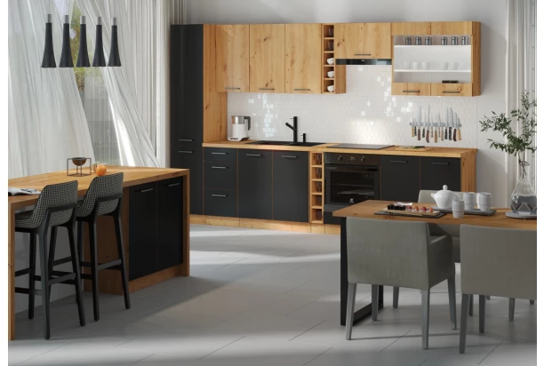 Horný kuchynský regál so šírkou 15 cm z programu Modena – kuchynský nábytok v drevodekore dub artisan pôsobí moderne a útulne zároveň. Jednotlivé elementy z kuchynského programu Modena môžete medzi sebou rôzne kombinovať a zostaviť si tak kuchyňu podľa vašich predstáv a priestorových možností.