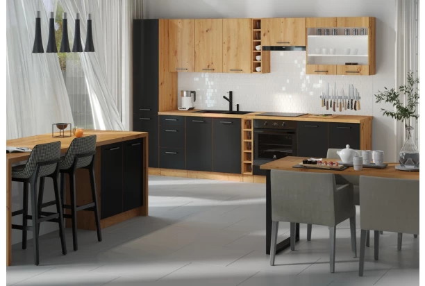 Dolný kuchynský regál so šírkou 15 cm z programu Modena – kuchynský nábytok v drevodekore dub artisan pôsobí moderne a útulne zároveň. Jednotlivé elementy z kuchynského programu Modena môžete medzi sebou rôzne kombinovať a zostaviť si tak kuchyňu podľa vašich predstáv a priestorových možností.