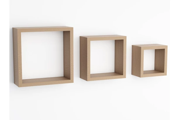 Sada 3 kusov poličiek v štvorcovom tvare v dekore dub sonoma prakticky poslúži v takmer každej miestnosti Vášho bytu. Tieto malé policové regály môžu byť rozmiestnené samostatne alebo tvoriť spoločnú kompozíciu. Vhodné na dekorácie, každodenné potreby, drobné knižky, kuchynské koreničky či poháre alebo čokoľvek iné.