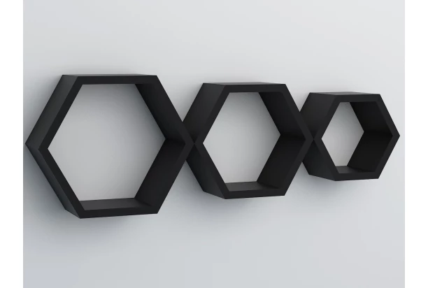 Súprava 3 kusov poličiek v tvare šesťuholníka v čiernej farbe prakticky poslúži v takmer každej miestnosti vášho bytu. Tieto malé policové regály môžu byť rozmiestnené samostatne alebo tvoriť spoločnú kompozíciu. Vhodné na dekorácie, každodenné potreby, drobné knižky, kuchynské koreničky či poháre alebo čokoľvek iné.
