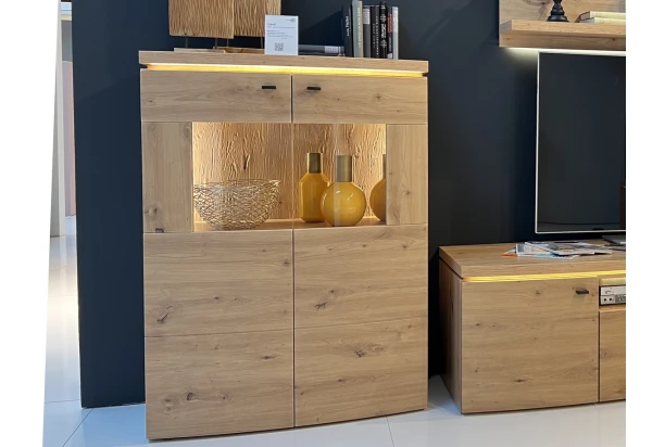 Presklená skrinka z kolekcie Bolus – originálne zaoblené predné plochy nábytku spolu s drevodekorom dub artisan pôsobí v interiéri veľmi elegantne, harmonicky a zároveň útulne. Zosilnený horný rám nábytku obsahuje zabudované osvetlenie, vďaka ktorému ešte viac vyniknú oblé tvary a útulná atmosféra interiéru počas večera. Navyše oceníte aj kvalitu spracovania, tento originálne riešený nábytok je vhodný aj pre náročných.