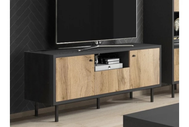 TV stolík z radu Bospe – čisto rovné línie nábytku zvýrazňujú kontrast čiernych plôch s drevodekorom dub wotan, ktorý pôsobí útulne a domácky. Nábytok dopĺňajú čierne úchytky a kovové nôžky, ktoré pôsobia vzdušne a zároveň umožňujú praktické udržovanie podlahy v byte. Univerzálnym štýlom sa tento nábytok hodí pre zariadenia takmer akéhokoľvek interiéru.