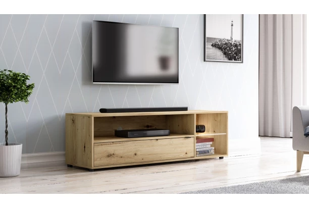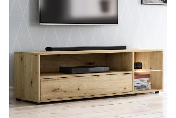 TV stolík v drevodekore dub artisan je široký 140 cm av interiéri pôsobí útulne. Široká priehradka ponúka dostatočný priestor pre elektroniku a za dvierkami nájdete vnútorný úložný priestor. Menšie odkladacie priehradky na strane dopĺňa sklenená polica s osvetlením, ktoré dotvára príjemnú atmosféru večera.