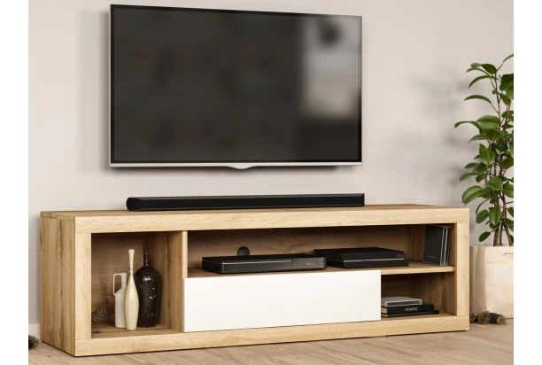 Jednoducho moderný TV stolík má optiku širokých bočných rámov a zaujímavé usporiadanie odkladacích priehradok. Za stredovými dvierkami ukrýva úložný priestor na drobné predmety. Vyrobený v kombinácii dub wotan/biela.