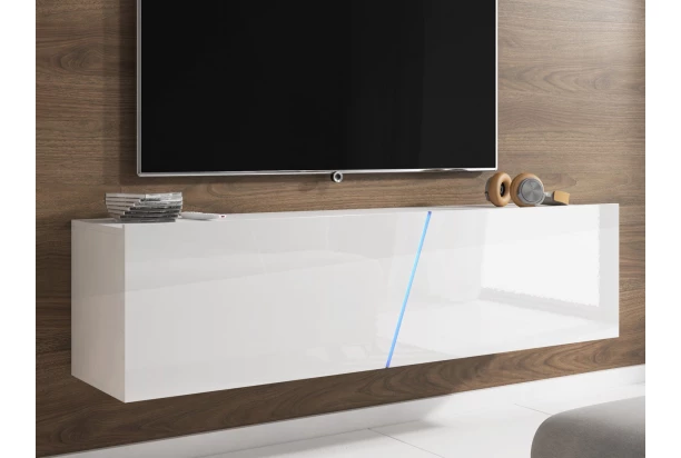 TV skrinka s osvetlením v kombinácii biely mat/biely lesk má moderný minimalistický dizajn a môže byť umiestnená klasicky na podlahu alebo zavesená na stenu. V priestore medzi zaujímavo skosenými dvierkami presvitá zabudované osvetlenie a vytvára tak zaujímavý večerný efekt. Pomocou diaľkového ovládača je možné meniť farbu svetla napríklad podľa nálady.