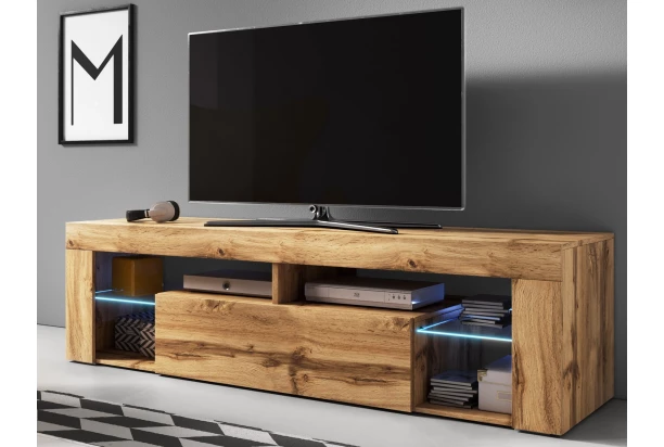 Moderný TV stolík so šírkou 140 cm je vyrobený v útulnom drevodekore dub wotan a skvele pasuje takmer do každého interiéru. Medzi širokými rámami nájdete odkladacie priehradky s policami aj dvierka s vnútorným úložným priestorom. Police z číreho skla môžete navyše doplniť o LED osvetlenie pre vytvorenie pôsobivej večernej atmosféry.