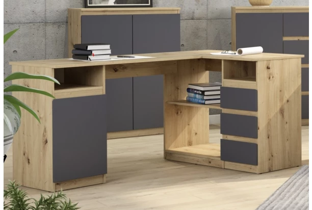 Rohový písací stôl v dekore dub artisan/grafit ponúka praktické úložné priestory z oboch strán, účelnosť a čisté línie tvarov, ktoré sa hodia do každého interiéru.