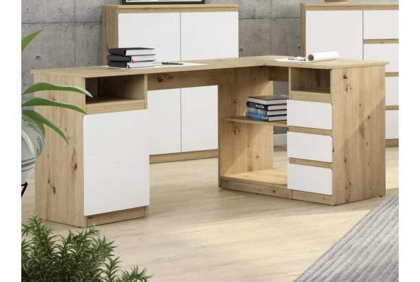 Rohový písací stôl v dekore dub artisan/biela ponúka praktické úložné priestory z oboch strán, účelnosť a čisté línie tvarov, ktoré sa hodia do každého interiéru.