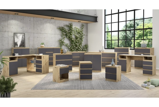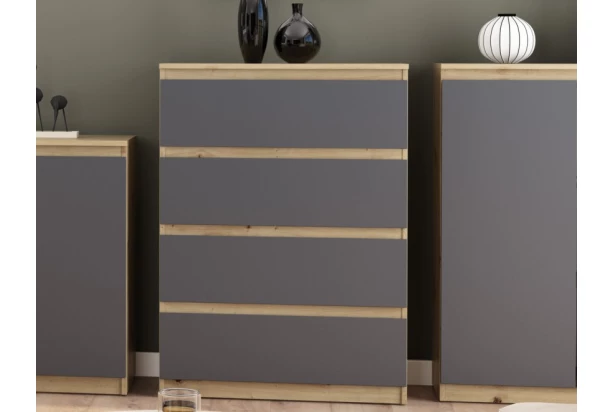 Komoda so šírkou 75 cm so 4 zásuvkami v dekore dub artisan/grafit ponúka praktické úložné priestory, účelnosť a čisté línie tvarov, ktoré sa hodia do každého interiéru.