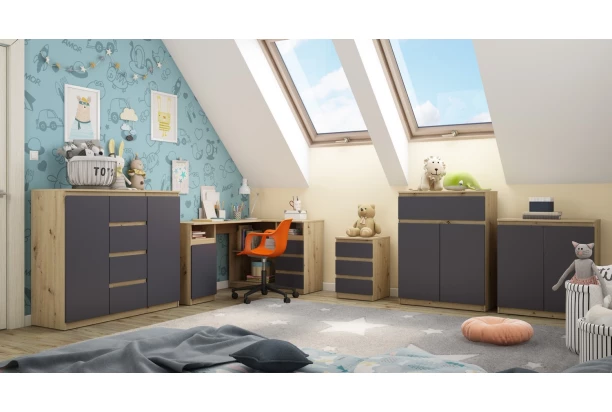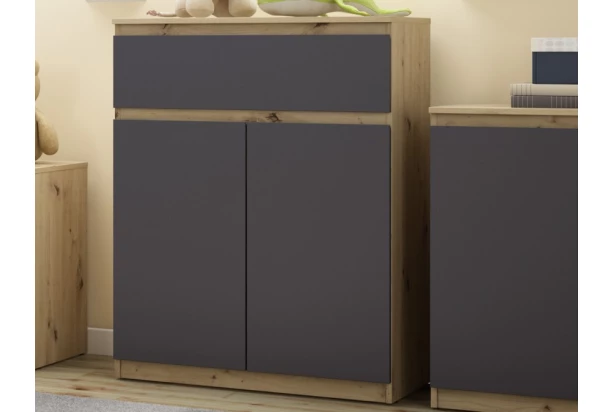 Skrinka so šuplíkom o šírke 80 cm v dekore dub artisan/grafit ponúka praktické úložné priestory, účelnosť a čisté línie tvarov, ktoré sa hodia do každého interiéru.